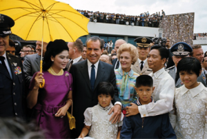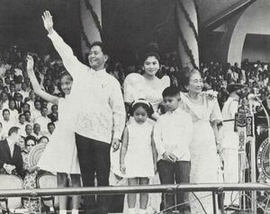 It was during the 1965 campaign that Imelda became influential as a political figure at the national level, supporting her husband’s political tactics through her charismatic appeal and youth.[70][71] Crowds of working-class Filipinos came out in droves to Marcos campaigns because they wanted to see the "beautiful wife of Marcos".[72][71]