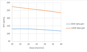 إنتاجية أدوات ليثوغرافيا الغمر مقابل الجرعة. الإنتاجية مقابل الجرعة يتم مقارنتها لمختلف قوى النبضات عند نفس عرض الشق.
