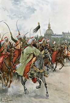 A squadron of Mamelukes (Escadron de Mamalukes) returned with Napoleon from the Egyptian Campaign in 1799. They were inducted into the Guard, and usually attached to the Chasseurs à Cheval. The squadron was never increased to a regiment in strength. Over the years their casualties were replaced from French cavalry regiments, or from any vaguely Middle Eastern related nationalities.[8]