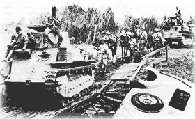 معركة سنغافورة، فبراير 1942. القوات اليابانية المنتصرة تسير في وسط المدينة (صورة من المتحف الحربي الامبراطوري).