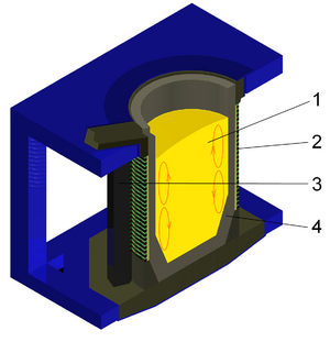 In the coreless type,[1] metal is placed in a crucible surrounded by a water-cooled alternating current solenoid coil. A channel-type induction furnace has a loop of molten metal, which forms a single-turn secondary winding through an iron core.[2][3]