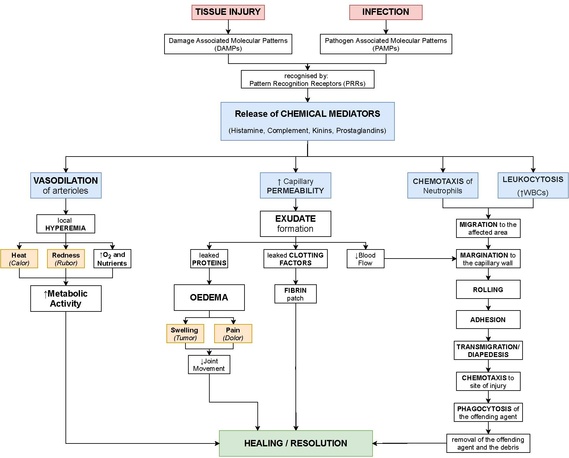 As defined, acute inflammation is an immunovascular response to inflammatory stimuli, which can include infection or trauma.[6][7] This means acute inflammation can be broadly divided into a vascular phase that occurs first, followed by a cellular phase involving immune cells (more specifically myeloid granulocytes in the acute setting).[6] The vascular component of acute inflammation involves the movement of plasma fluid, containing important proteins such as fibrin and immunoglobulins (antibodies), into inflamed tissue.