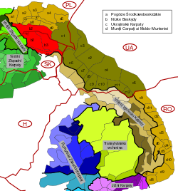 The division is largely (with many exceptions) undisputed at the lowest level (except for the Ukrainian part), but various divisions are given for the higher levels, especially for the penultimate level. A geomorphological division has been used as much as the data was available; other new physiogeographic divisions were used in other cases. Where the classification of a higher level "title" is known/sure, it is added at the end of the name in brackets, e.g. "(subprovince)".