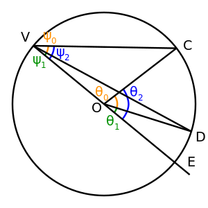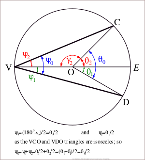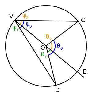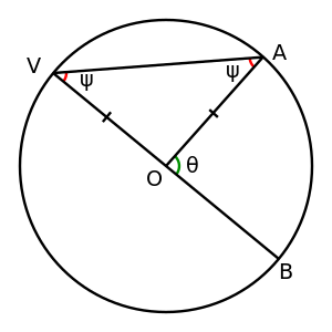Let O be the center of a circle, as in the diagram at right. Choose two points on the circle, and call them V and A. Designate point B to be diametrically opposite point V. Draw chord VB, a diameter containing point O. Draw chord VA. Angle BVA is an inscribed angle that intercepts arc قالب:Overarc; denote it as ψ. Draw line OA. Angle BOA is a central angle that also intercepts arc قالب:Overarc; denote it as θ.