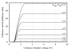 - يتصرف انخفاض الجهد الأمامي في الحالة في IGBT بشكل مختلف تماماً عن موسفتات الطاقة. ويمكن نمذجة انخفاض الجهد في الموسفت كمقاومة، مع انخفاض الجهد المتناسب مع التيار. على النقيض من ذلك، يحتوي IGBT على انخفاض في الجهد يشبه الصمام الثنائي (عادةً بترتيب 2V) يزداد فقط مع لوغاريتم التيار. بالإضافة إلى ذلك، تكون مقاومة الموسفت عادةً أقل بالنسبة لجهود الحجب الأصغر، لذا فإن الاختيار بين IGBTs والموسفتات للطاقة سيعتمد على كل من جهد الحجب والتيار المتضمن في تطبيق معين.