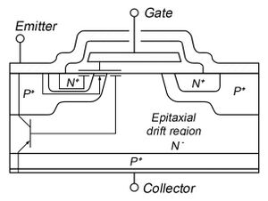 يتم إنشاء خلية IGBT بشكل مشابه للبناء العمودي للقناة- n power MOSFET، باستثناء استبدال استنزاف n + بطبقة مجمع p +، وبالتالي تشكيل عمودي من النوع PNP ترانزستور ثنائي القطب. هذه المنطقة الإضافية p + تخلق اتصالاً متسلسلاً لترانزستور الوصلة ثنائي القطب PNP مع موسفت القناة السطحية-n.