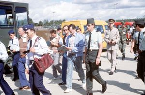مصحوباً بنظرائهم من حلف الناتو، مراقبون سوڤيت يدخلون منطقة تخزين أسلحة نووية في گرينم، بالمملكة المتحدة، 1989
