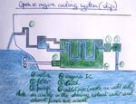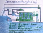 4ـ جريان سائل التبريد: يخرج الماء البارد من أسفل المشع بفعل المضخة، ثم يدخل إلى قمصان التبريد حول الأسطوانات من الأسفل، ويخرج من أعلى الأسطوانات إلى غطائها ومن غطاء الأسطوانة، وعبر المنظم الحراري يصل الماء إلى المشع من الأعلى من جديد، وتتم عملية تبريد الماء بتيار الهواء الذي يخترق المشع وذلك بفعل مروحة التبريد.