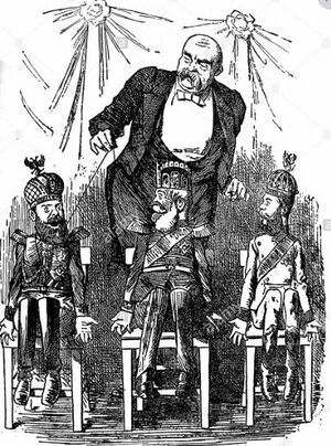 Bismarck manipulates the three emperors – Alexander III of Russia, William I of Germany and Francis Joseph of Austria-Hungary – like a ventriloquist's puppets; John Tenniel 1884 PUNCH