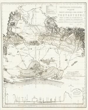 Though the idea of a railway was the one initially proposed and which would be ultimately executed, the lead engineer, the Italian-born Gaetano Moro, advocated for the creation of a ship canal with 150 locks instead, estimating the cost of its construction at the "woefully optimistic" sum of nearly £3.4 million pounds sterling (roughly $13.5 million US dollars), using the Caledonian Canal, in Scotland, as a model. The "Canal of Tehuantepec" proposal "differs in no extraordinary degree [...] from similar works already executed in Great Britain, France, Holland, or the United States," as an account of the project published in 1846 stated. The proposal was to join the waters of the Ostuta River with the Chicapa River nearby, which discharge into Laguna Inferior and Laguna Superior respectively, using trenches, then deliver the waters to the site of Tarifa, and from there create the canal using the nearby rivers, such as the Tarifa, Chichihua and Malatengo to the Gulf and the Chicapa to the Pacific.[10] Garay was officially given the land the concession granted him in March 1843 after delivering the results of the survey, being secured by the Minister of Foreign Affairs and Home Department José María Bocanegra. However, the concession would have expired in July 1844 since the project fell stagnant due to a lack of funds (despite getting access to free labor from three hundred convicts in October,[11] also secured by Bocanegra), but Garay asked for a two-year long renewal a few days before the deadline.[12][5]