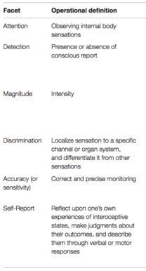 - ^ Harshaw, Christopher (2015). "Interoceptive dysfunction: Toward an integrated framework for understanding somatic and affective disturbance in depression". Psychological Bulletin (in الإنجليزية). 141 (2): 311–363. doi:10.1037/a0038101. PMC 4346391. PMID 25365763.