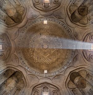 The most impressive monument to survive from this period is the Soltaniyeh Mausoleum built for Sultan Uljaytu (ح. 1304–1317), a massive dome supported on a multi-level octagonal structure with internal and external galleries. Only the domed building remains today, missing much of its original turquoise tile decoration, but it was once the centerpiece of a larger religious complex including a mosque, a hospital, and living areas.[59] Smaller tombs and shrines in honour of local Sufis were also built or renovated by Ilkhanid patrons, such as the shrine of Bayazid Bastami in the town of Bastam, the aforementioned Mausoleum of Pir-i Bakran, and the aforementioned Tomb of Abd-al-Samad.[60] Also in Bastam, the Ilkhanids built a traditional tower tomb to house the remains of Uljaytu's infant son. Unusually, rather than being an independent structure, the tomb was erected behind the qibla wall of the town's main mosque – a configuration also found in some contemporary Mamluk architecture.[60]