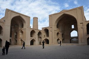 Various mosques were built or expanded during this period, usually following the four-iwan plan for congregational mosques (e.g. at Varamin and Kirman), except in the northwest, where cold winters discouraged the presence of an open courtyard, as at the Jameh Mosque of Ardabil (now ruined). Another hallmark of the Ilkhanid period is the introduction of monumental mosque portals topped by twin minarets, as seen at the Jameh Mosque of Yazd.[57] Caravanserais were built again, although the Khan al-Mirjan in Baghdad is the only surviving example.[57]
