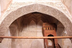 It is around this period that many of the distinctive features of subsequent Iranian and Central Asian architecture first emerged, including the use of baked brick for both construction and decoration, the use of glazed tile for surface decoration, and the development of muqarnas (three-dimensional geometric vaulting) from squinches. Hypostyle mosques continued to be built and there is also evidence of multi-domed mosques, though most mosques were modified or rebuilt in later eras.[35] The Jameh Mosque of Na'in, one of the oldest surviving congregational mosques in Iran, contains some of the best-preserved features from this period, including decorative brickwork, Kufic inscriptions, and rich stucco decoration featuring vine scrolls and acanthus leaves that draw from the earlier styles of Samarra.[35][33]