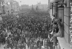 The Easter Rising of 1916 and its aftermath caused a profound shift in public opinion towards the republican cause in Ireland.[6] In the December 1918 General Election, the republican Sinn Féin party won a large majority of the Irish seats in the British parliament: 73 of the 105 constituencies returned Sinn Féin members (25 uncontested).[7] The elected Sinn Féin MPs, rather than take their seats at Westminster, set up their own assembly, known as Dáil Éireann (Assembly of Ireland). It affirmed the formation of an Irish Republic and passed a Declaration of Independence.[8] The subsequent War of Independence, fought between the Irish Republican Army (IRA) and British security forces, continued until July 1921 when a truce came into force. By this time the Parliament of Northern Ireland had opened, established under the Government of Ireland Act 1920, presenting the republican movement with a fait accompli and guaranteeing the British presence in Ireland.[9] In October negotiations opened in London between members of the British government and members of the Dáil, culminating in the signing of the Anglo-Irish Treaty on 6 December 1921.[10]