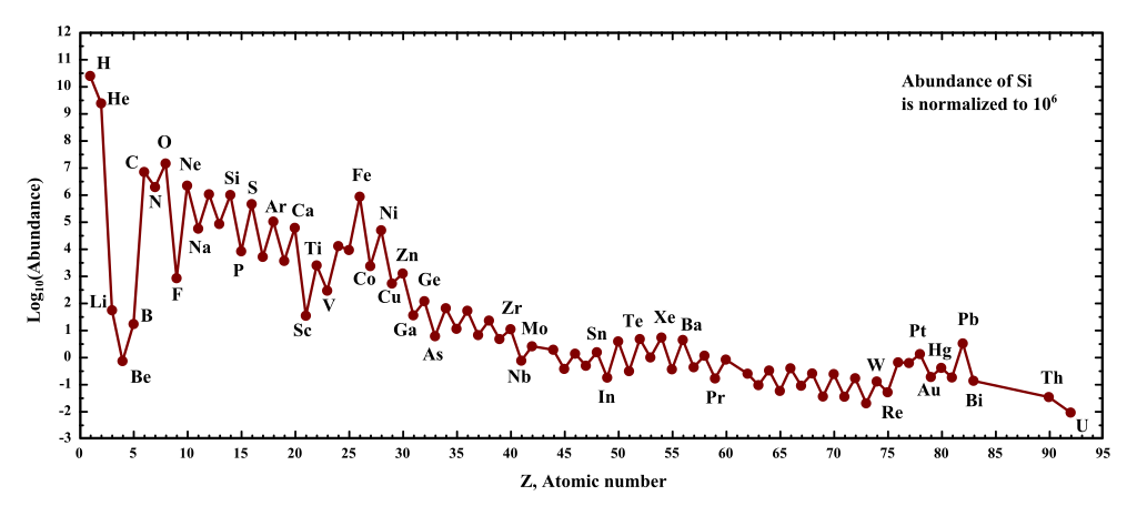 توافر العناصر الكيميائية في المجموعة الشمسية. يُعدّ الهيدروجين والهليوم أكثر العناصر شيوعاً، وهما من نتاج الانفجار العظيم. أما العناصر الثلاثة التالية (اللثيوم، والبريليوم، والبورون) فهي نادرة نظراً لقلة إنتاجها في الانفجار العظيم وفي النجوم أيضاً. ويتمثل الاتجاهان العامان في العناصر المتبقية المنتجة نجمياً في: (1) تناوب وفرة العناصر تبعاً لأرقامها الذرية الزوجية أو الفردية، و(2) انخفاض عام في توافر العناصر كلما ازداد وزنها. ويمكن ملاحظة "ذروة الحديد" في العناصر القريبة من الحديد كأثر ثانوي، حيث يزيد التوافر النسبي للعناصر ذات النوى الأكثر ارتباطاً.