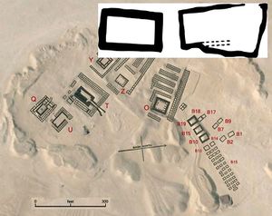 Iry-Hor's tomb at the Umm el-Qa'ab comprises two separate chambers B1 and B2, shown in inset. Iry-Hor's tomb is located close to Ka's (B7, B8, B9) and Narmer's tombs (B17, B18).
