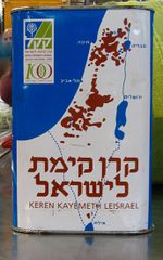 صناديق تبرعات JNF اِستُخدِمت في التجمعات اليهودية حول العالم لجمع تبرعات لشراء الأراضي وزراعة الغابات وتوطين اليهود في فلسطين السابقة (إسرائيل الحالية).