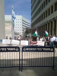 15 أبريل 2010: سكان شفا عمرو يحتجون أمام المحكمة في حيفا على ملاحقة المشتبه في قيامهم بقتل إدن نتان-زادا. الأعلام الفلسطيني أصبحت ظاهرة متنامية في مظاهرات العرب في إسرائيل في العقد الأول من القرن 21.