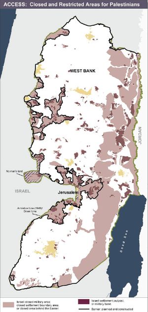 الاحتلال الإسرائيلي للضفة الغربية، بدأ في 7 يونيو 1967، عندما احتلت القوات الإسرائيلية المنطقة (وتشمل القدس الشرقية)، التي كانت في ذلك الوقت تحت الإدارة الأردنية، أثناء حرب 1967، واستمر إلى يومنا هذا.[ز] تأكد وضع الضفة الغربية كأراضي محتلة عسكرياً من قبل محكمة العدل الدولية وباستثناء القدس الشرقية، من قبل المحكمة العليا الإسرائيلية.[1] وجهة النظر الرسمية للحكومة الإسرائيلية هي أن قوانين الاحتلال العسكري لا تنطبق على المناطق التي تدعي أنها "متنازع عليها"، وأنها تدير الضفة الغربية، باستثناء القدس الشرقية، بموجب الإدارة المدنية الإسرائيلية، التابعة لوزارة الدفاع الإسرائيلية.[2][3][س] الذي يعتبر مثالاً كلاسيكياً على النزاع "الذي يستعصي تسويته"،[6][ش] كانت فترة الاحتلال الإسرائيلي تعتبر بالفعل استثنائية بعد عقدين من الزمن، وهي الآن الأطول في التاريخ الحديث.[7][ص][8][9] وقد أوردت إسرائيل عدة أسباب للاحتفاظ بالضفة الغربية: مطالبة تستند إلى فكرة الحقوق التاريخية في هذا كوطن كما ادعى وعد بلفور لعام 1917؛ أسباب أمنية داخلية وخارجية؛ والقيمة الرمزية العميقة للمنطقة المحتلة بالنسبة لليهود.[10]