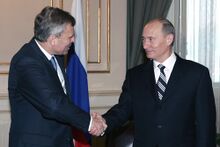 Secretary General of NATO Jaap de Hoop Scheffer and President of Russia Vladimir Putin during a meeting at the 2008 Bucharest summit in Bucharest on 4 April 2008.