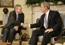 Secretary General of NATO Jaap de Hoop Scheffer and President of the United States George W. Bush during a meeting in the Oval Office in the White House on 27 October 2006.