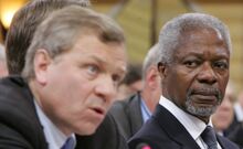 Secretary General of NATO Jaap de Hoop Scheffer and Secretary-General of the United Nations Kofi Annan during the Munich Security Conference of 2005 on 12 February 2005.
