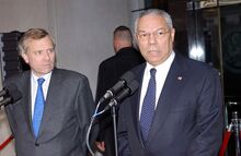 Secretary General of NATO Jaap de Hoop Scheffer and United States Secretary of State Colin Powell during a press conference at the Harry S Truman Building on 10 November 2004.