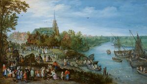 Like his father, Jan Brueghel also painted various village landscapes. He used the surrounding landscapes as the stage for the crowds of anecdotal, colourfully dressed peasants who engage in various activities in the market, the country roads and during the rowdy kermesses.[36] Jan Brueghel's landscape paintings with their strong narrative elements and attention to detail had a significant influence on Flemish and Dutch landscape artists in the second decade of the 17th century. His river views were certainly known to painters working in Haarlem, including Esaias van de Velde and Willem Buytewech, whom Brueghel may have met there when he accompanied Peter Paul Rubens on a diplomatic mission to the Dutch Republic in 1613.[38]