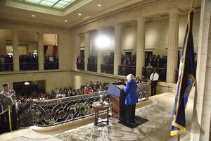 On December 20, 2013, the U.S. Senate voted 59–34 for cloture on Yellen's nomination.[71] On January 6, 2014, she was confirmed as chair of the Federal Reserve by a vote of 56–26,[72] the narrowest margin ever for the position.[73] Yellen was a trailblazer as the first woman to head the U.S. central bank, or any major central bank, and the first Democrat to do so since Paul Volcker assumed that position in 1979 via President Jimmy Carter.[74] She was sworn into office on February 3, 2014,[75] and was previously elected as FOMC chair on January 30.[76] According to a Fed representative, on Yellen's request, her title would be altered to "chair" rather than "chairman" or "chairwoman", as she prefers a gender-neutral manner.[54][12] Only one woman had ever led the central bank of a G8 country before Yellen – Russia's Elvira Nabiullina.[77]