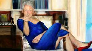 فقد ظهرت لوحة غريبة للرئيس الأسبق بفستان أزرق وحذاء نسائي في منزل إبستين بمدينة نيويورك.