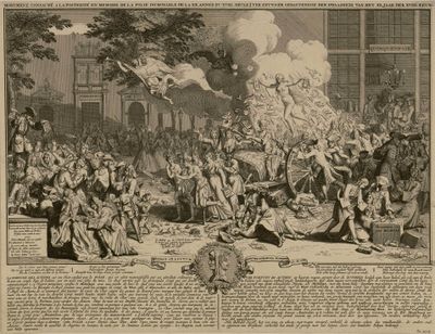 حفر ساخر من برنار پيكار حول مختلف نواحي « نظام لو » وإفلاسه في 1720. (النص بالفرنسية وبالهولندية).