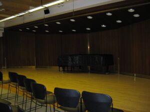 The Juilliard School occupies a single main building, the Irene Diamond Building, in the Lincoln Center for the Performing Arts, along Broadway and W 65th Street. The Juilliard building contains several large studio rooms and performance venues, such as the Glorya Kaufman Dance Studio, Stephanie P. McClelland Drama Theater, Harold and Mimi Steinberg Drama Studio, the Judith Harris and Tony Woolfson Orchestral Studio, and Edwin and Nancy Marks Jazz Rehearsal Room. Recital halls include the Peter Jay Sharp Theater, Paul Recital Hall, and the Morse Recital Hall.[64][65] The building also houses the Alice Tully Hall, where the Chamber Music Society of Lincoln Center performs.[66]