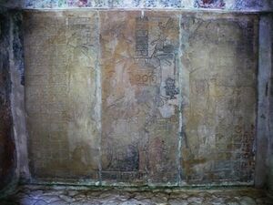 He continued the ambitious project of adorning Palenque with fine art and architecture begun by his father; his most important addition to the city of Palenque was the Temple of the Cross which is the center piece of the Temple of the Cross Complex. He was succeeded by his younger brother, Kʼinich Kʼan Joy Chitam II, another brother was probably Tiwol Chan Mat.[2][3] The monuments and text associated with Kʼinich Kan Bahlam II are: Tablets and Alfardas of the Temples of the Cross, Sun and Foliated Cross; tablets and facade of the Temple of the Inscriptions; Temple 17 Panel; Death's Head; Jonuta Panel; Temple of the Cross Stela.[4][5]