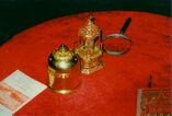 The "Kanishka casket" or "Kanishka reliquary", dated to the first year of Kanishka's reign in 127 CE, was discovered in a deposit chamber under Kanishka stupa, during the archaeological excavations in 1908–1909 in Shah-Ji-Ki-Dheri, just outside the present-day Ganj Gate of the old city of Peshawar.[41][42] It is today at the Peshawar Museum, and a copy is in the British Museum. It is said to have contained three bone fragments of the Buddha, which are now housed in Mandalay, Burma.