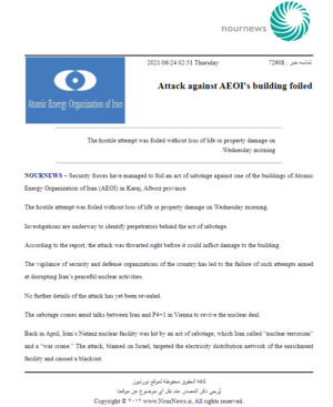 - ^ "صور جوية تكذّب إيران.. أضرار بمركز نووي". alarabiya. 2021-07-04. Retrieved 2021-07-04.