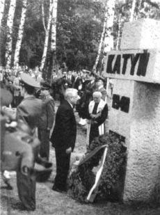 Russian President Boris Yeltsin visits Powązki Cemetery monument to Katyn victims, Warsaw, 1993.[1]