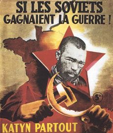 German WWII propaganda poster (in French) exploiting the massacre. The text reads: If the Soviets should win the war... Katyn [will be] everywhere!