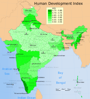Kerala is the state with the lowest positive population growth rate in India (3.44%) and has a density of 860 people per km2. The state has the highest Human Development Index (HDI) (0.790) in the country according to the Human Development Report 2011.[9] It also has the highest literacy rate 95.5%, the highest life expectancy (Almost 77 years) and the highest sex ratio (as defined by number of women per 1000 men: 1,084 women per 1000 men) among all Indian states. Kerala has the lowest homicide rate among Indian states, for 2011 it was 1.1 per 100,000.[10] A survey in 2005 by Transparency International ranked it as the least corrupt state in the country. Kerala has witnessed significant emigration of its people, especially to the Gulf states during the Gulf Boom during the 1970s and early 1980s, and its economy depends significantly on remittances from a large Malayali expatriate community. Hinduism is practised by more than half of the population, followed by Islam and Christianity. The culture of the state traces its roots from 3rd century CE. It is a synthesis of Aryan and Dravidian cultures, developed over centuries under influences from other parts of India and abroad.