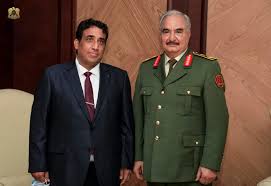 وجاء في بيان صدر عن مكتبه أن حفتر أعرب عن "دعم القوات المسلحة لعملية السلام وسعي الجيش للحفاظ على الديمقراطية والتداول السلمي للسلطات ودعم المجلس الرئاسي الجديد وحكومة الوحدة الوطنية التي أنتجها الحوار السياسي لتوحيد المؤسسات والوصول بالبلاد إلى الانتخابات المنتظرة في (كانون الأول)ديسمبر القادم". ووصل المنفي إلى مطار بنينا في مدينة بنغازي آتياً من اليونان وتوجه فوراً للقاء حفتر في مقره في الرجمة، الواقعة على بعد حوالى 25 كم خارج المدينة.