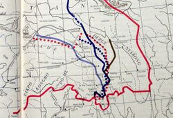 ROC's control in Kham: Light blue line on the west represents the boundary in 1912–1917, after which the ROC was pushed back to the brown line during 1918–1932. By 1945, it arrived at the dotted red line. The dark blue was the Simla Convention boundary that ROC turned down.