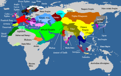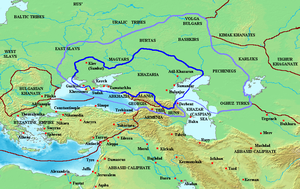 Khazar Khaganate and surrounding states, c. 820 (area of direct Khazar control in dark blue, sphere of influence in purple).
