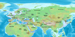 The Qağanate of the Khazars thus took shape out of the ruins of this nomadic empire as it broke up under pressure from the Tang dynasty armies to the east sometime between 630 and 650.[42] After their conquest of the lower Volga region to the East and an area westwards between the Danube and the Dniepr, and their subjugation of the Onoğur-Bulğar union, sometime around 670, a properly constituted Khazar Qağanate emerges,[49] becoming the westernmost successor state of the formidable Göktürk Qağanate after its disintegration. According to Omeljan Pritsak, the language of the Onoğur-Bulğar federation was to become the lingua franca of Khazaria[50] as it developed into what Lev Gumilev called a "steppe Atlantis" (stepnaja Atlantida/ Степная Атлантида).[51] Historians have often referred to this period of Khazar domination as the Pax Khazarica since the state became an international trading hub permitting Western Eurasian merchants safe transit across it to pursue their business without interference.[52] The high status soon to be accorded this empire to the north is attested by Ibn al-Balḫî's Fârsnâma (c. 1100), which relates that the Sasanian Shah, Ḫusraw 1, Anûsîrvân, placed three thrones by his own, one for the King of China, a second for the King of Byzantium, and a third for the king of the Khazars. Although anachronistic in retrodating the Khazars to this period, the legend, in placing the Khazar qağan on a throne with equal status to kings of the other two superpowers, bears witness to the reputation won by the Khazars from early times.[53][54]