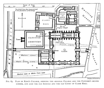 With the courtyard to the south of the chapel now able to accommodate the college, the land to the north was sold to the university in 1828. It has been erroneously claimed that this was the site of the world's first bonsai tree, cultivated in King's College in the mid 18th century.[22][23][24]The university demolished most of the original Old Court buildings in order to make room for an extension to the University Library; only the gateway arch opposite Clare College survives. The library subsequently moved away from this site, known as the Old Schools, and the buildings are currently used for the main administrative offices of the university.[21][25]