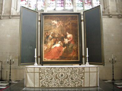 The College Chapel, an example of late Gothic architecture, was built over a period of a hundred years (1446–1531) in three stages. The Chapel features the world's largest fan vault ceiling; 26 large stained-glass windows, 24 of which date from the 16th century; and Peter Paul Rubens's painting the Adoration of the Magi as an altarpiece.