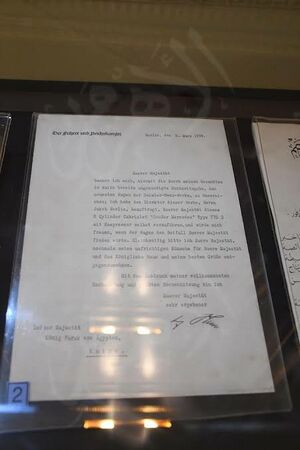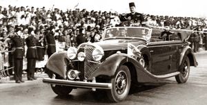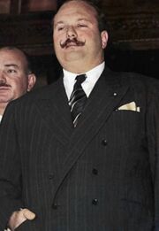 In November 1943, Farouk went driving with Pulli in his red Cadillac to Ismalia to see a yacht he just purchased when he was involved in an automobile incident when his attempt to bypass a British Army truck by speeding caused him to hit another car head-on.[58] At attempt to place Farouk on a stretcher failed when the grossly overweight king turned out to be too heavy, causing the stretcher to break under his weight.[58] Farouk had suffered two broken ribs as a result of the car accident, but he liked being in a British Army hospital so much, flirting with the nurses, that he pretended to be injured far longer than what he really was.[59] As a result, Farouk missed the Cairo Conference when the U.S. President Franklin D. Roosevelt, the British Prime Minister Winston Churchill and the Chinese Generalissimo Chiang Kai-shek all arrived in Cairo to discuss war plans against Japan for 1944, through he appeared to have no regrets, preferring to spend his time flirting with the nurses and buying them gifts that were worth more than their annual salaries.[60] On 15 December 1943, Farouk was finally forced to end his convalescence when Farida gave birth to another daughter, Princess Fadia, which disappointed him, and caused him to lash out in anger against her for only giving him daughters.[60] Reflecting a continuing interest in the Balkans, the region where his family came from, Farouk by 1943 hosted King Zog I of Albania, King Peter II of Yugoslavia and King George II of Greece, telling all three kings that he wanted Egypt to play a role in the Balkans after the war, as he was proud of his Albanian ancestry.[60]