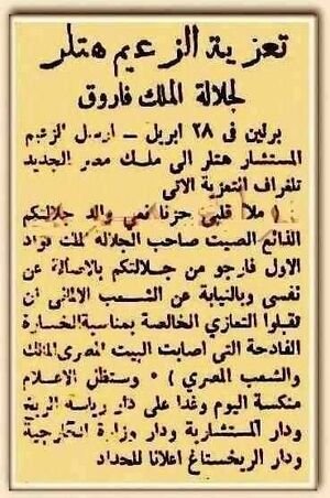 The day before Farouk was tentatively due to be deposed, Prince Hassanein arrived at the British Embassy with a letter for Lampson saying: "I am commanded by His Majesty to inform Your Excellency that he has decided to leave the present Government in Office for the time being".[68] As Nahas became unpopular, he sought to embrace Arab nationalism to rally support, having Egypt join the Arab League in October 1944 and speaking more and more about "the Palestine question".[69] In October 1944, when Lampson went away for a vacation in South Africa, Farouk finally dismissed Nahas as prime minister on 8 October 1944, and replaced him with Ahmed Maher, the brother of Ali Maher.[70] The dismissal of Nahas was seen by Lampson as a personal defeat, who complained in his diary that he would never have a politician "in our pocket" like him again, and was seen as a decisive turning point when Farouk had finally outwitted Lampson.[71] But at the same time, Lampson admitted that Nahas by his corruption had become a liability, and that Britain could not continue to support a corrupt government in the long run, as the British people would not tolerate going to war with Egypt to keep someone like Nahas in office.[72]