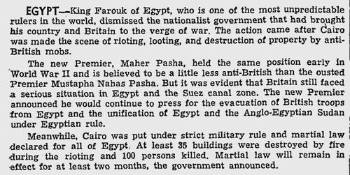 Caffery reported in his cable to Washington that he was appalled that Nahas, whom Caffery called the stupidest and most corrupt politician in Egypt, was now prime minister.[123] Caffery stated that Nahas was unqualified to be prime minister because of his "completely total ignorance of the facts of life as they apply to the situation today", giving the example: