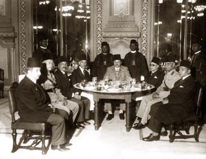 In 1919, it had been a great humiliation for the Egyptians that Egypt had been excluded from the Paris Peace Conference that led to the Treaty of Versailles and the League of Nations, causing the revolution of 1919.[81] Farouk was determined that this time that Egypt would be a founding member of the United Nations, which would show the world that the country was ending British influence in Egyptian affairs.[81] On 24 February 1945, Prime Minister Maher had the Chamber of Deputies issue declarations of war against Germany and Japan, and as he was leaving the Chamber, he was assassinated by Mahmoud Isawi, a member of the pro-Axis Young Egypt Society.[81] Isawi was shaking Maher's hand and then pulled out his handgun, shooting the prime minister three times while screaming that he had betrayed Egypt by declaring war on Germany and Japan.[81] When Lampson arrived at the Koubbeh Palace to see Farouk, he wrote he was shocked instead to see instead "it was the wicked Aly Maher who was receiving condolences".[82] As a result, Egypt attended the peace conference in San Francisco in April 1945 that founded the United Nations.[81]