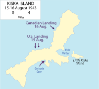 On August 15, 1943, an invasion force consisting of 34,426 Allied troops, including elements of the 7th Infantry Division, 4th Infantry Regiment, 87th Mountain Infantry Regiment, 5,300 Canadians (mainly the 13th Canadian Infantry Brigade from the 6th Infantry Division, with supporting units including two artillery units from the 7th Infantry Division, 95 ships including three battleships and a heavy cruiser, and 168 aircraft landed on Kiska, only to find the island completely abandoned.